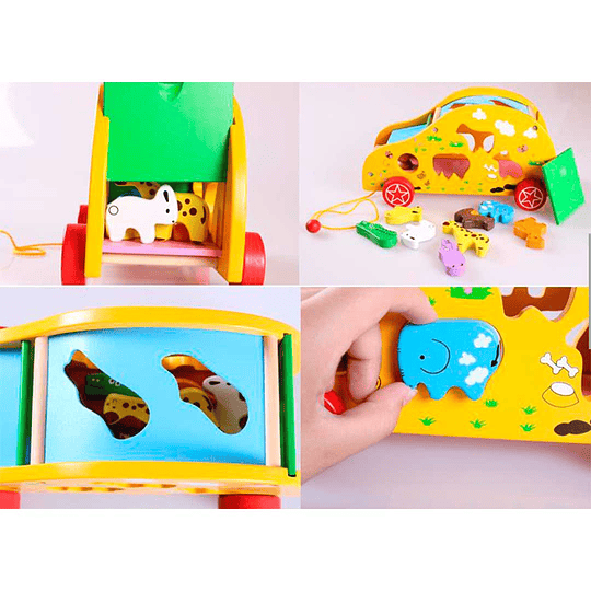 Hermoso automóvil de madera de arrastre con encaje y con ocho animales diferentes de varios colores .