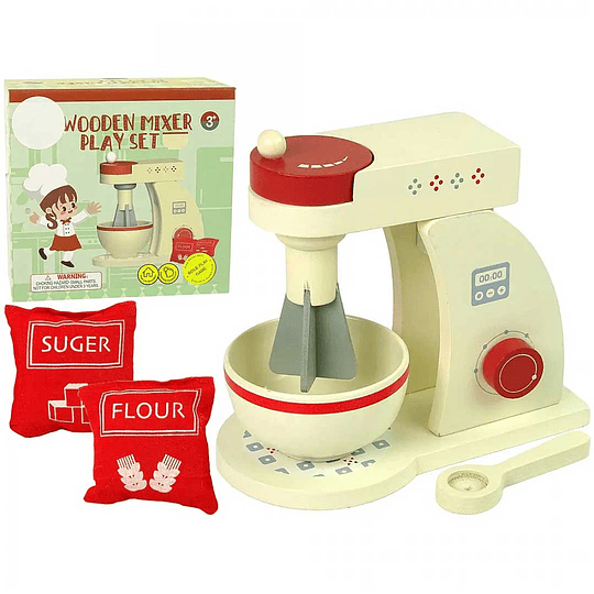 ¡Hermoso! Este set contiene una batidora de madera y diversos accesorios para que los niños jueguen a cocinar y hornear.
